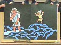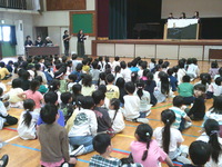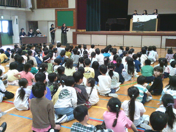 30分休みには、体育館に移動し、図書ボランティアの皆様による大型絵本の読み聞かせなどが行われました。大きな絵本に目を輝かせながら、物語の世界に引き込まれていく子どもたち。静かに耳を傾け、時折笑顔を見せる姿から、本のもつ力と、読み聞かせの温かさが伝わってきました。